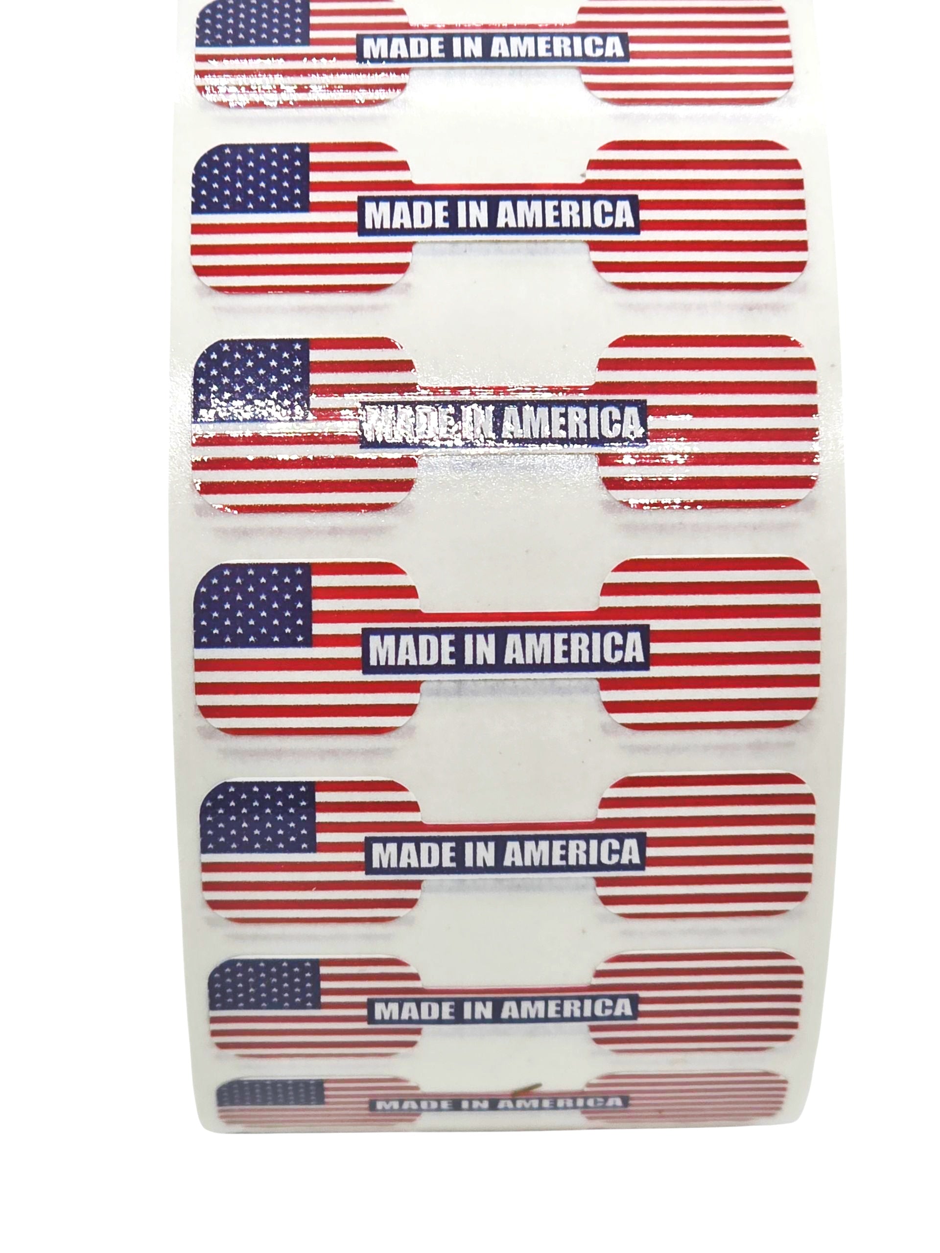 Each label features a full-color American flag background with “Made in America” printed across the center. These labels are perfect for sealing jars, boxes, bags, vials, and other product packaging.